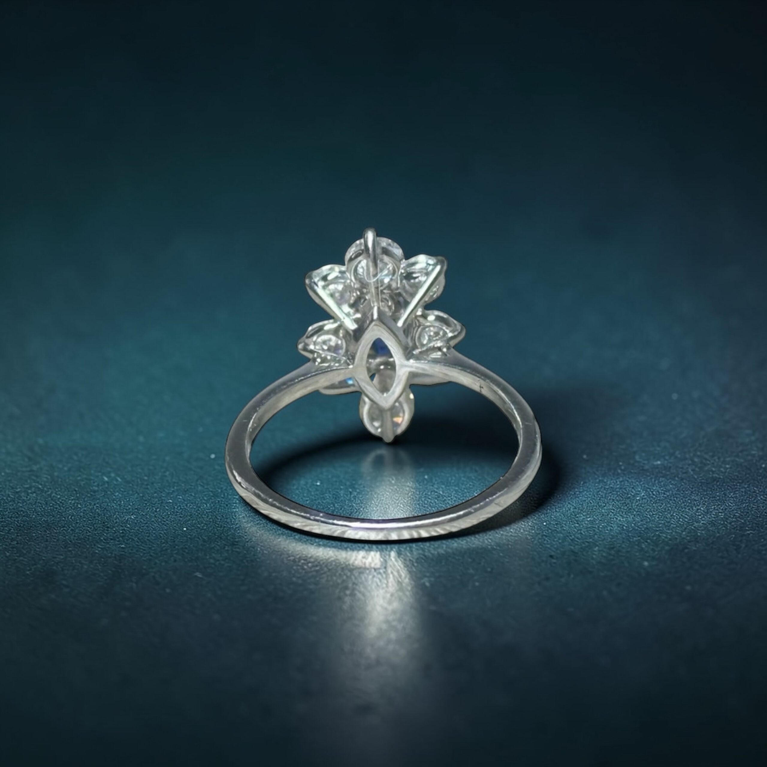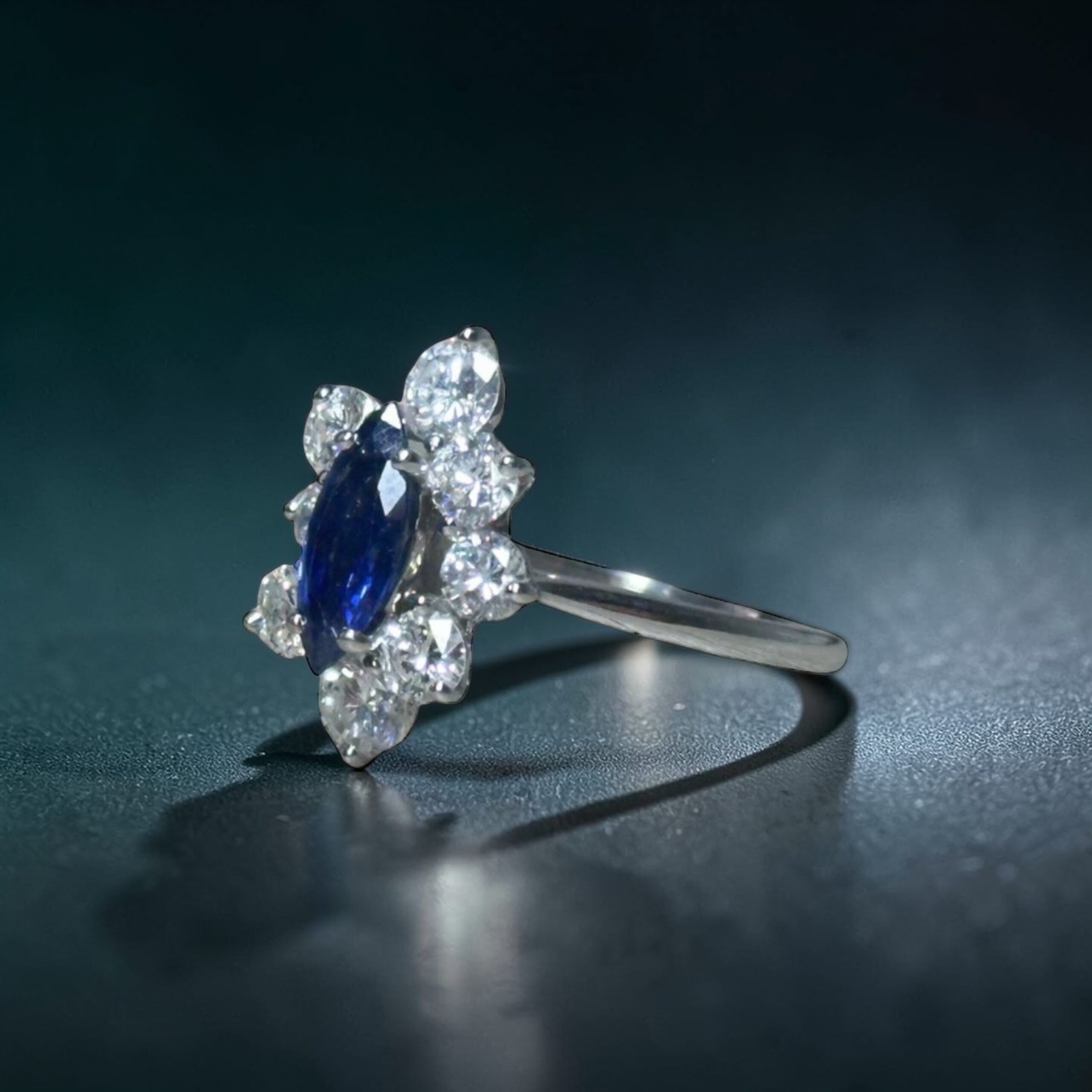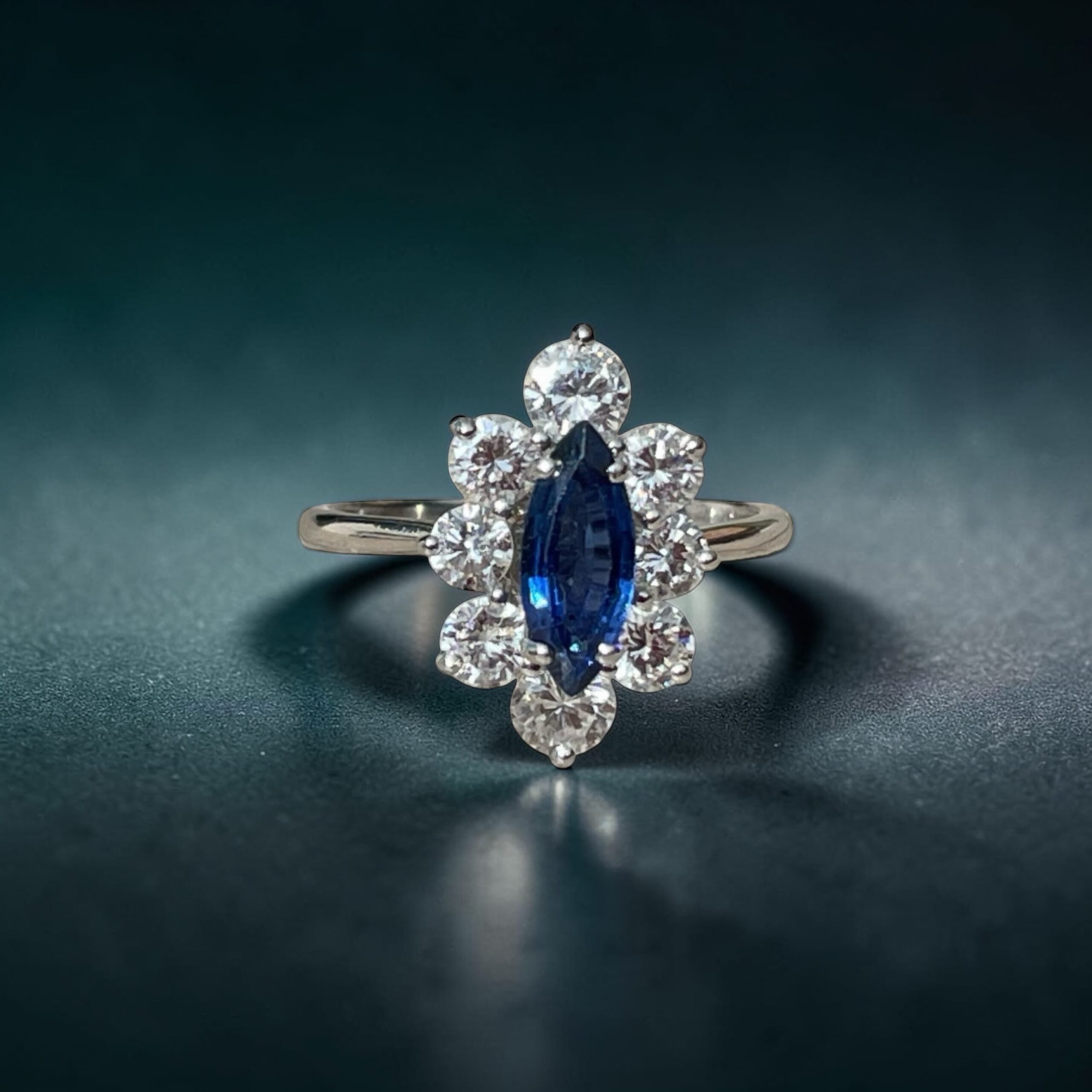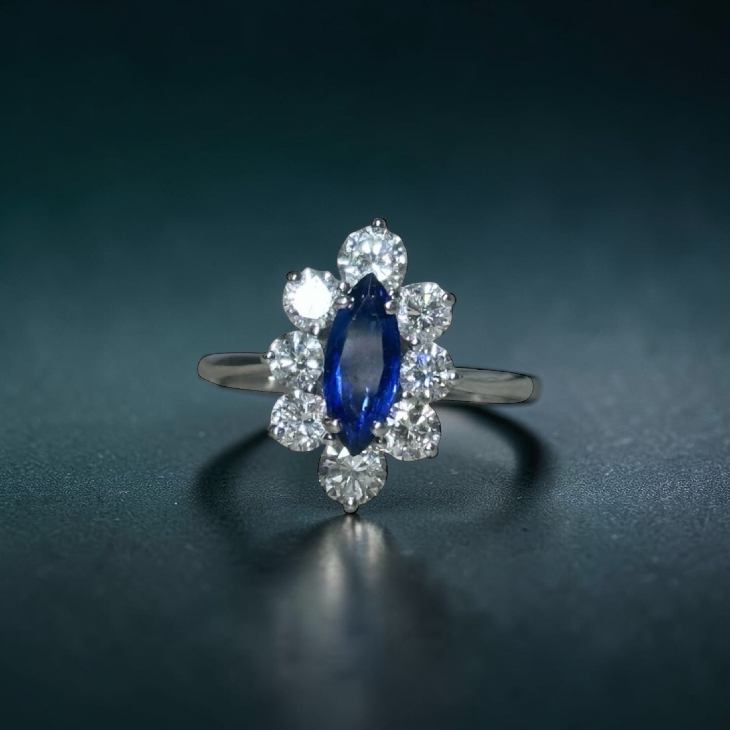 Bague saphir marquise 0.80 ct et diamants 1.50 ct en or 18 carats