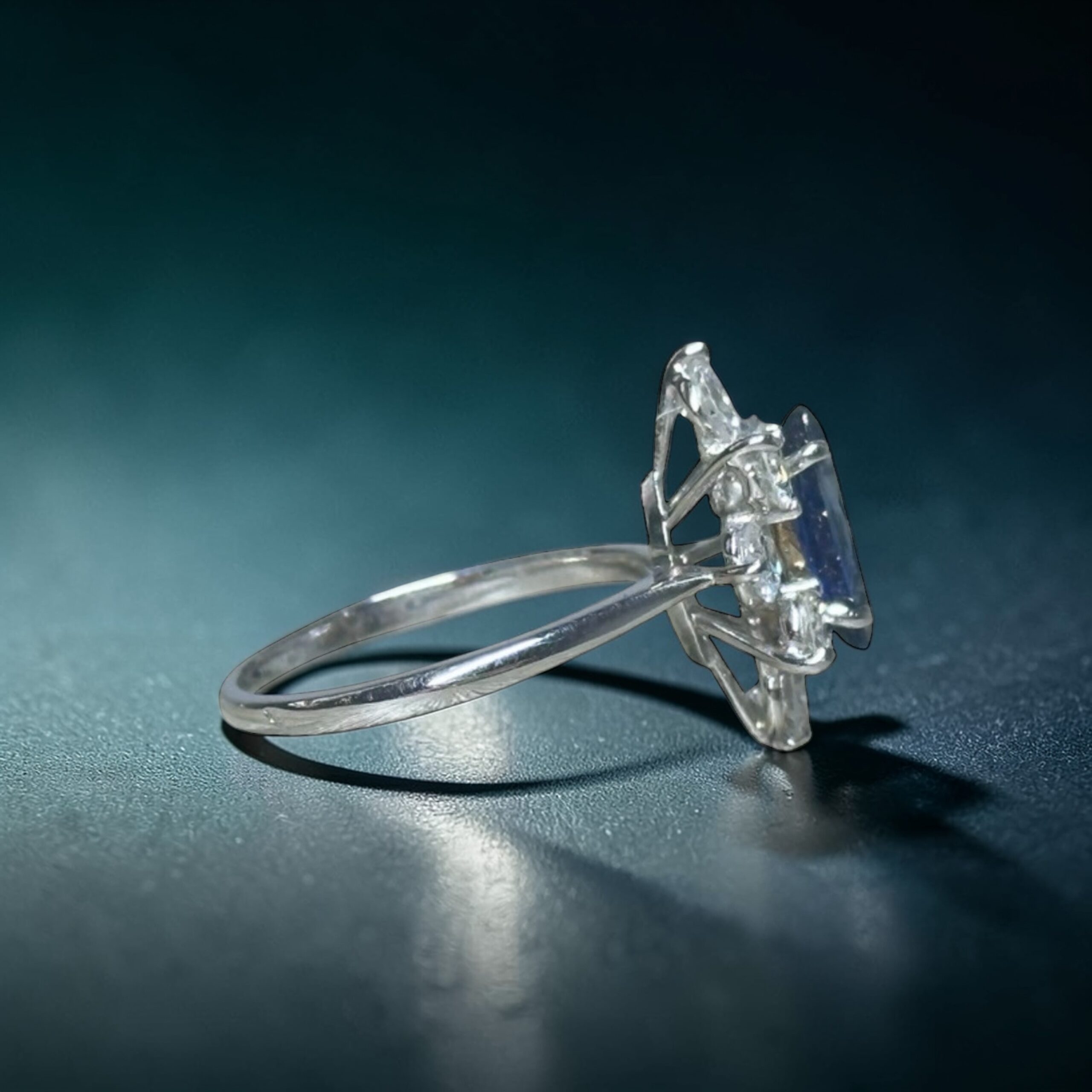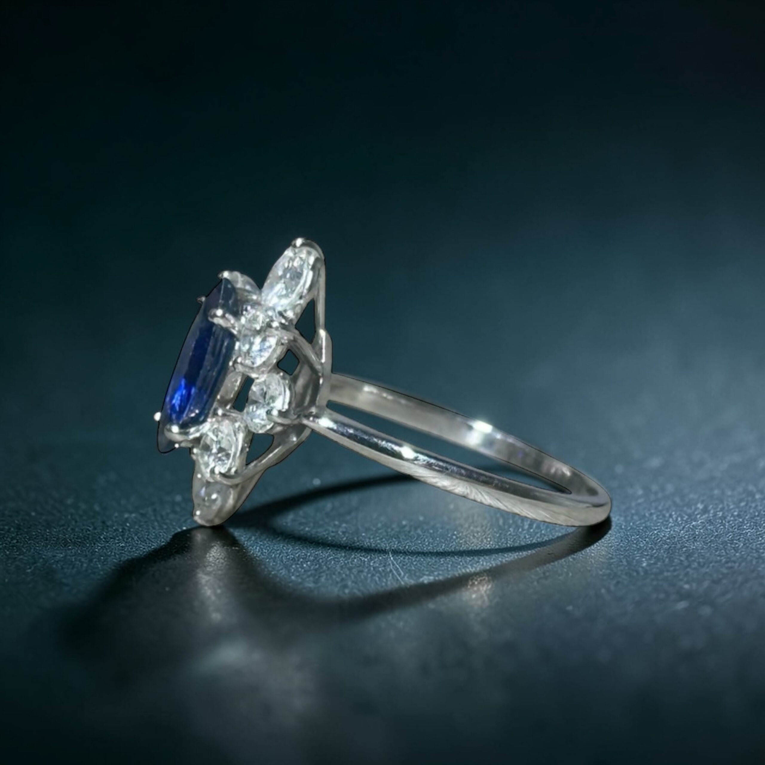 Élégante et lumineuse, cette bague en or blanc 18 carats incarne parfaitement le raffinement de la joaillerie classique. En son centre, un saphir naturel taillé en marquise d’environ 0,80 carat capte le regard par sa profondeur et son intensité.