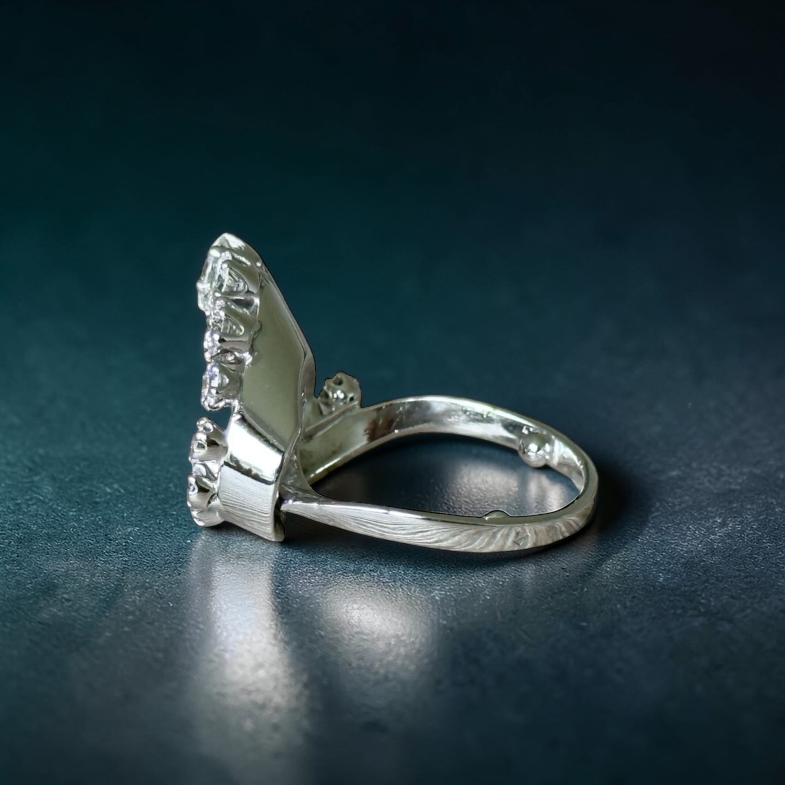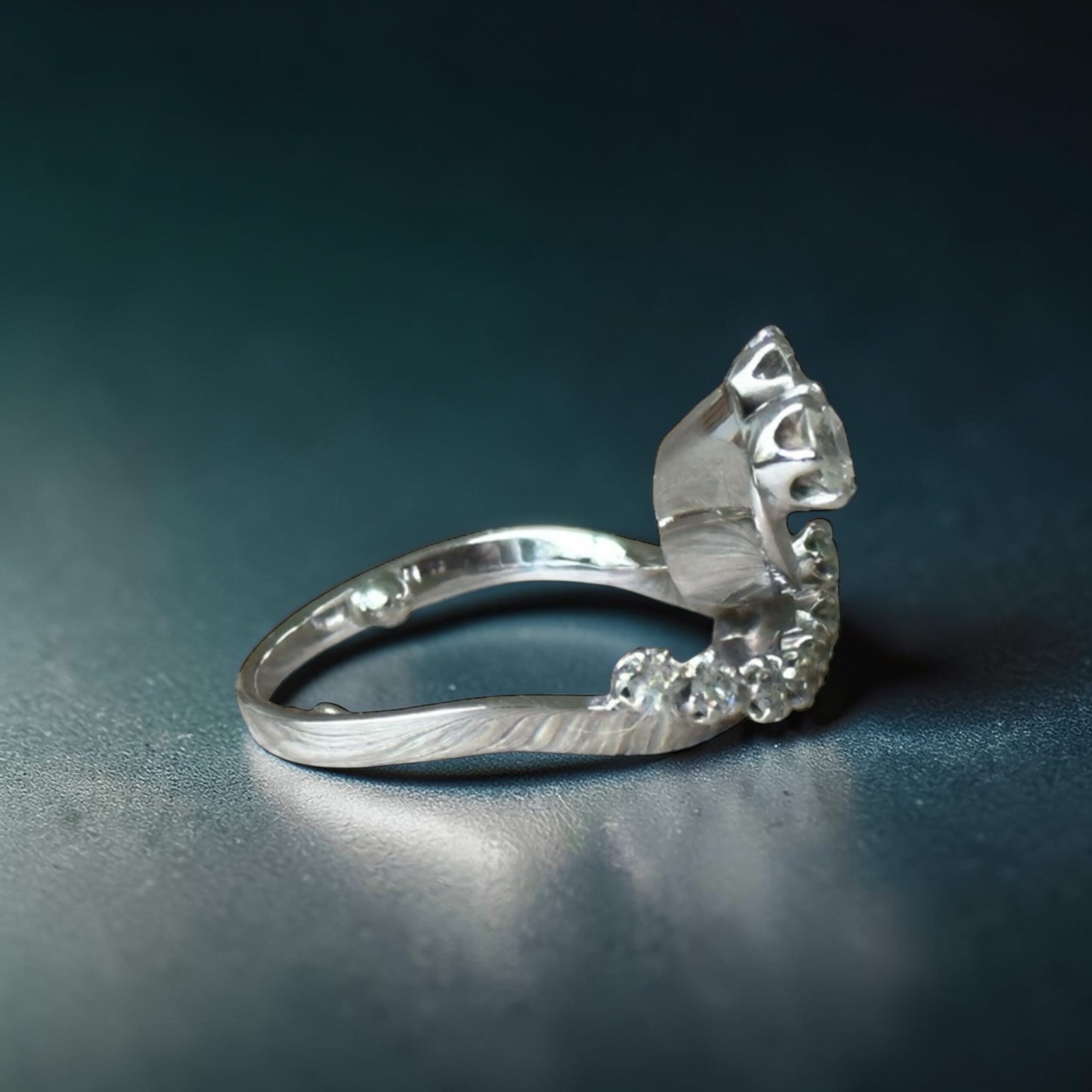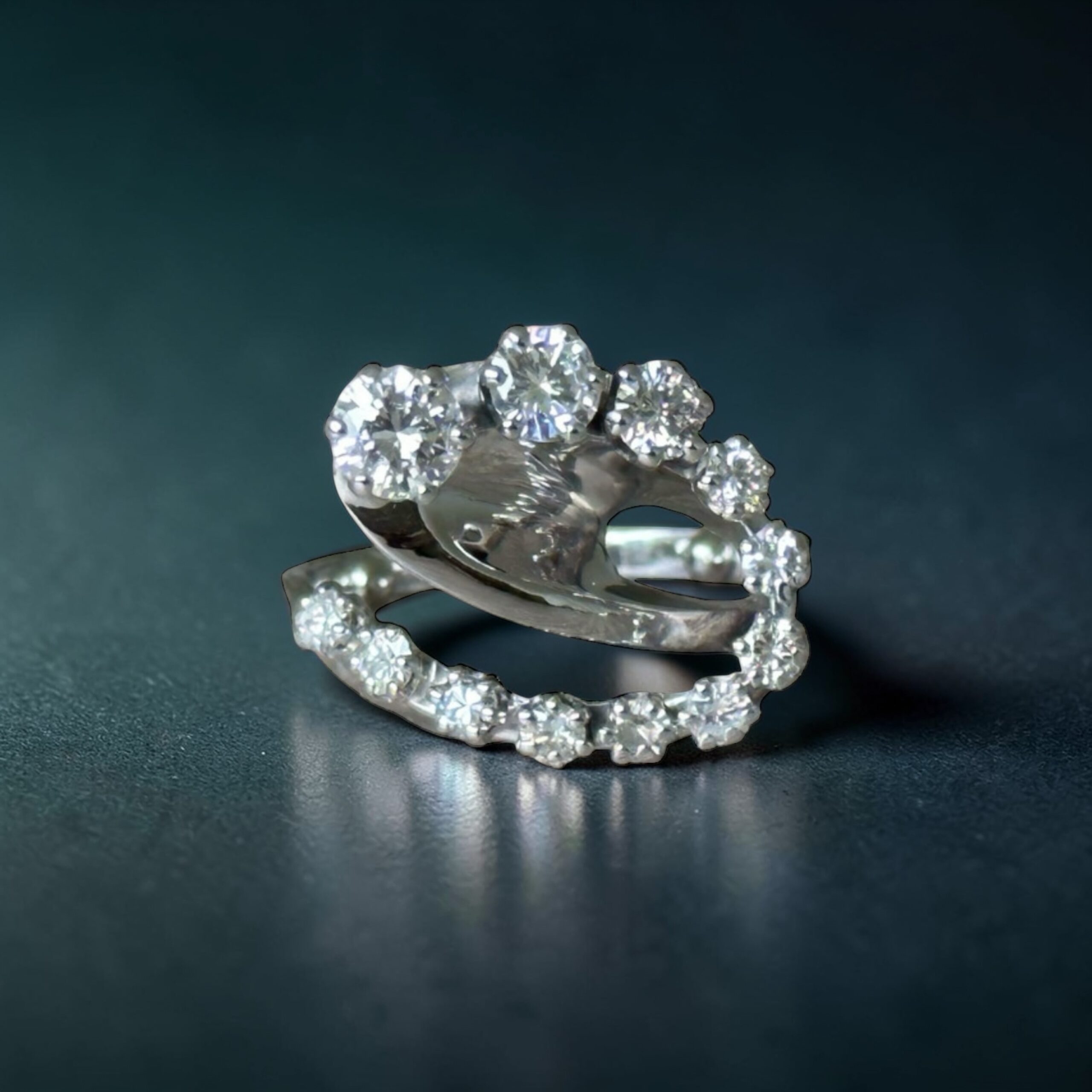 Cette pièce est sertie de 12 diamants naturels, disposés du plus petit au plus imposant dans un mouvement ascendant, créant un effet de vague lumineuse particulièrement élégant. Les trois diamants principaux (environ 0.35 ct, 0.25 ct et 0.15 ct) structurent la bague et renforcent son impact visuel, tandis que les autres pierres prolongent la brillance sur toute la courbe.