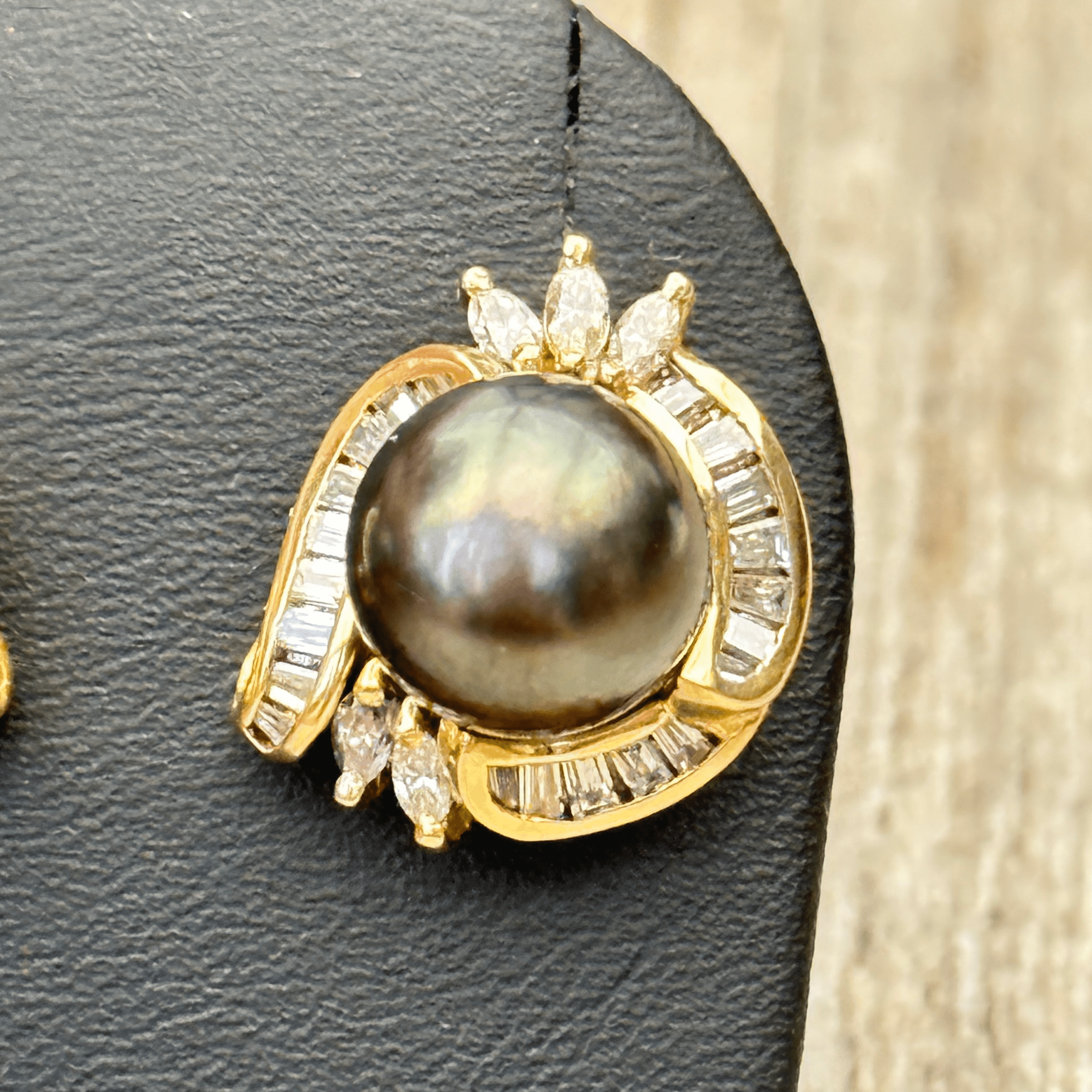 En plus de la perle de Tahiti, ces boucles d’oreilles sont également ornées de diamants ronds et baguettes, d’un total de 2 carats. Les diamants ajoutent une brillance supplémentaire et mettent en valeur la perle centrale.